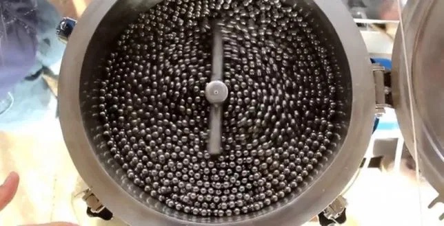 При производстве шоколада используется так называемая "шариковая мельница": в крутящуюся бочку насыпано очень много металлических шариков. И когда шоколад разогревают - его по тех. процессу в эту бочку наливают.